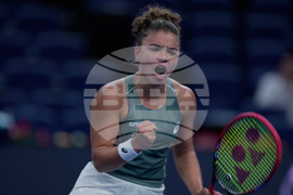Jasmine Paolini, of Italy reacts after scoring a point against Marie Bouzkova, of the Czech Republic during the women's singles match of the China Open tennis tournament, in Beijing, Tuesday, Sept. 30, 2025. (AP Photo/Andy Wong)