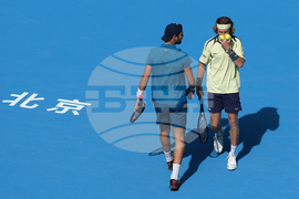 Harri Heliovaara, of Finland talk to his partner Henry Patten, of Britain during the men's doubles final match against Andrey Rublev and Karen Khachanov, of Germany, in the China Open tennis tournament, at the National Tennis Center, in Beijing, Wednesday, Oct. 1, 2025. (AP Photo/Andy Wong)