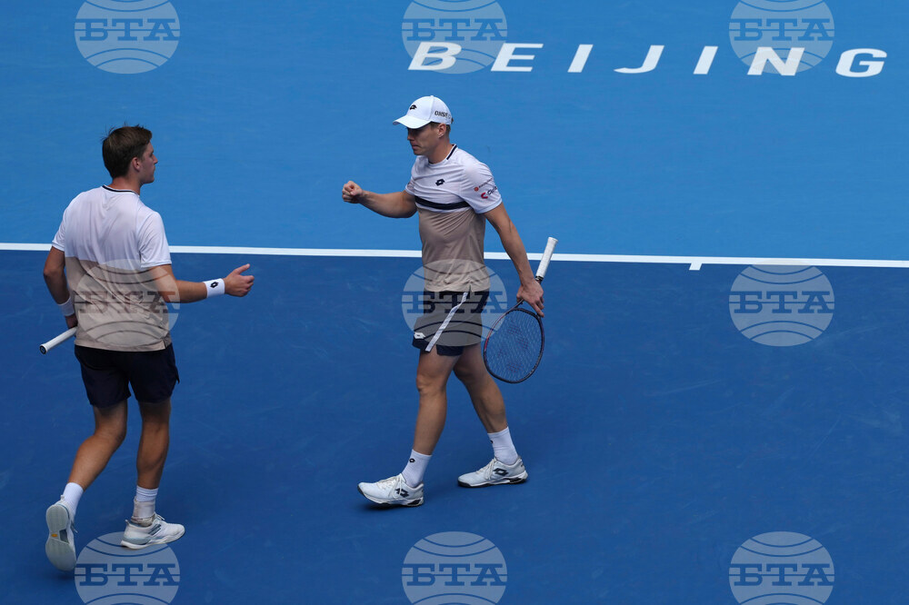 Harri Heliovaara of Finland and Henry Patten of Britain react during play against Andrey Rublev and Karen Khachanov in the men's doubles final match for the China Open tennis tournament in Beijing on Wednesday, Oct. 1, 2025. (AP Photo/Andy Wong)