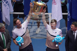 Andrey Rublev, right walks away as Harri Heliovaara of Finland and Henry Patten of Britain celebrate with their trophy in the men's doubles final match for the China Open tennis tournament in Beijing on Wednesday, Oct. 1, 2025. (AP Photo/Andy Wong)