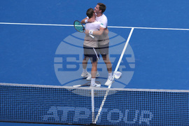 Harri Heliovaara of Finland and Henry Patten of Britain are congratulated after defeating Andrey Rublev and Karen Khachanov in the men's doubles final match for the China Open tennis tournament in Beijing on Wednesday, Oct. 1, 2025. (AP Photo/Andy Wong)