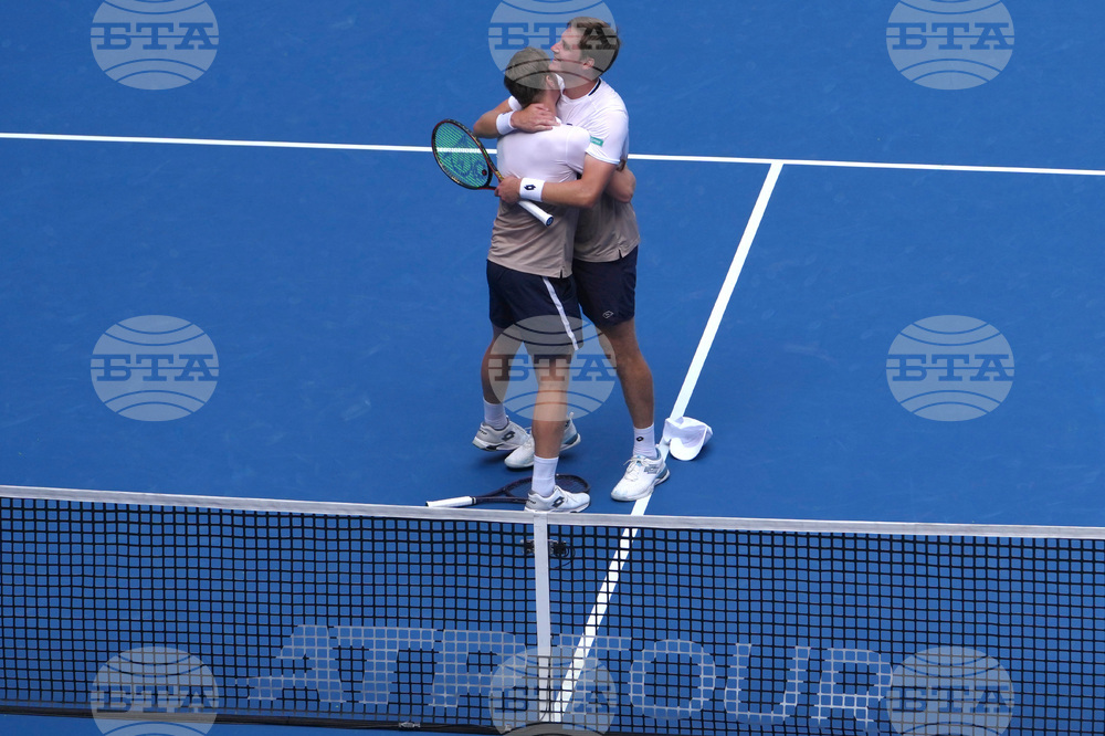 Harri Heliovaara of Finland and Henry Patten of Britain celebrate after defeating Andrey Rublev and Karen Khachanov in the men's doubles final match for the China Open tennis tournament in Beijing on Wednesday, Oct. 1, 2025. (AP Photo/Andy Wong)