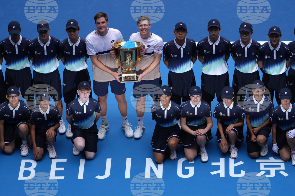 Harri Heliovaara of Finland, right and Henry Patten of Britain pose with their trophy after defeating Andrey Rublev and Karen Khachanov of Russia in the men's doubles final match for the China Open tennis tournament in Beijing on Wednesday, Oct. 1, 2025. (AP Photo/Mahesh Kumar A.)