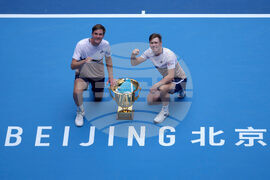 Harri Heliovaara of Finland, right and Henry Patten of Britain celebrate with their trophy after defeating Andrey Rublev and Karen Khachanov of Russia in the men's doubles final match for the China Open tennis tournament in Beijing on Wednesday, Oct. 1, 2025. (AP Photo/Mahesh Kumar A.)
