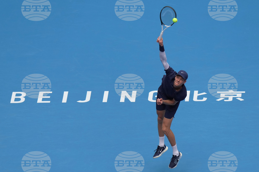 Learner Tien of the United States returns a shot from Jannik Sinner of Italy in the men's singles final match for the China Open tennis tournament in Beijing on Wednesday, Oct. 1, 2025. (AP Photo/Andy Wong)