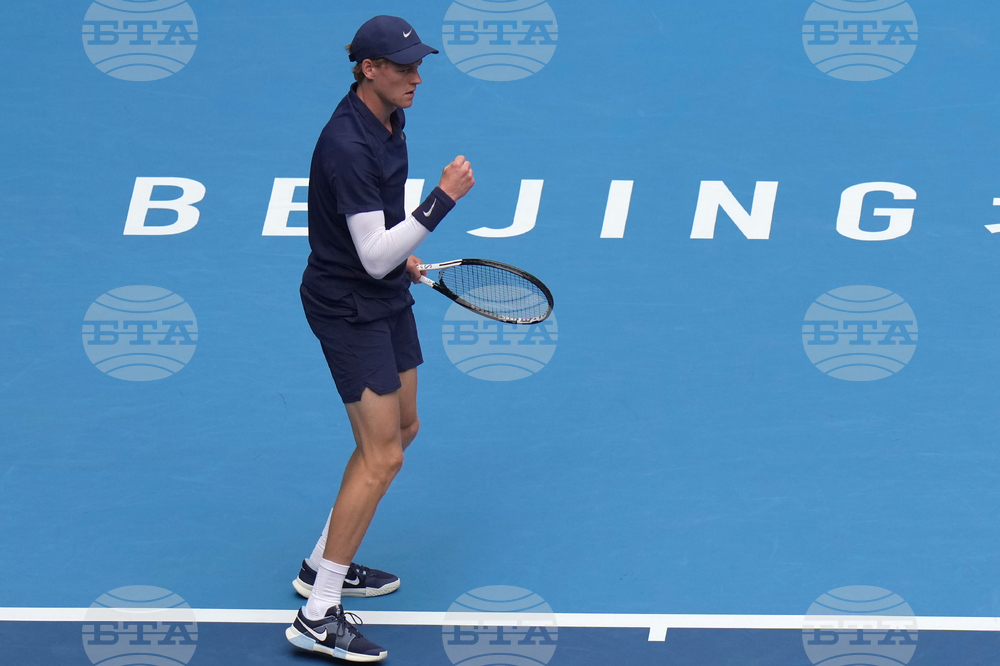 Jannik Sinner of Italy reacts during play against Learner Tien of the United States in the men's singles final match for the China Open tennis tournament in Beijing on Wednesday, Oct. 1, 2025. (AP Photo/Mahesh Kumar A.)