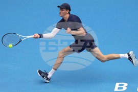 Jannik Sinner of Italy returns a forehand shot to Alex De Minaur of Australia during the men's singles semifinal match for the China Open tennis tournament, in Beijing, China, Tuesday, Sept. 30, 2025. (AP Photo/Mahesh Kumar A.)