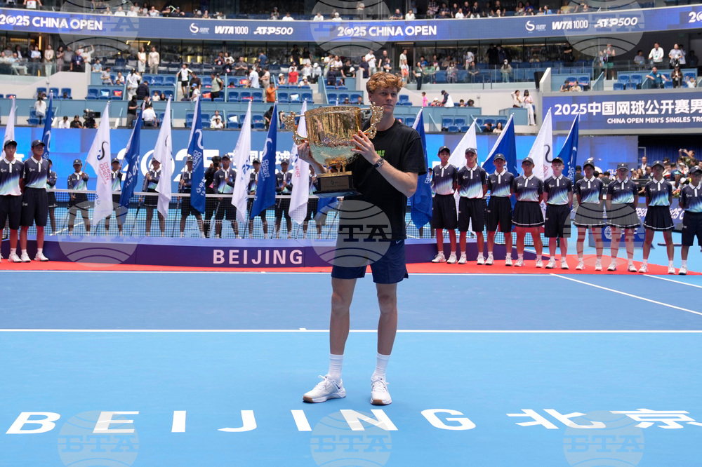 Jannik Sinner of Italy reacts with his trophy after defeating Learner Tien of the United States in the men's singles final match for the China Open tennis tournament in Beijing on Wednesday, Oct. 1, 2025. (AP Photo/Mahesh Kumar A.)