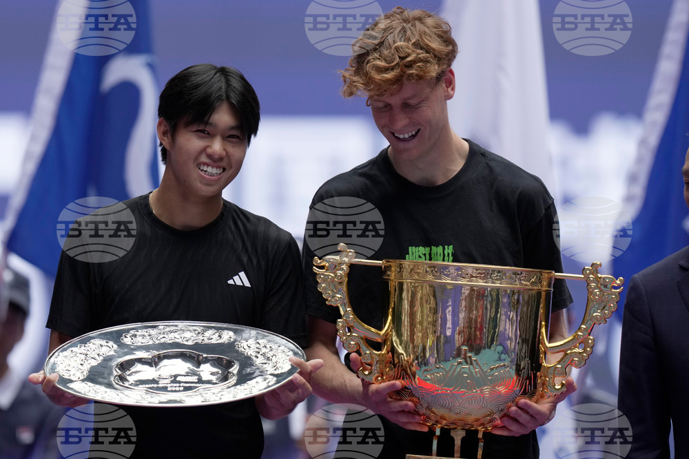 Jannik Sinner of Italy, right reacts with his trophy after defeating Learner Tien of the United States in the men's singles final match for the China Open tennis tournament in Beijing on Wednesday, Oct. 1, 2025. (AP Photo/Mahesh Kumar A.)