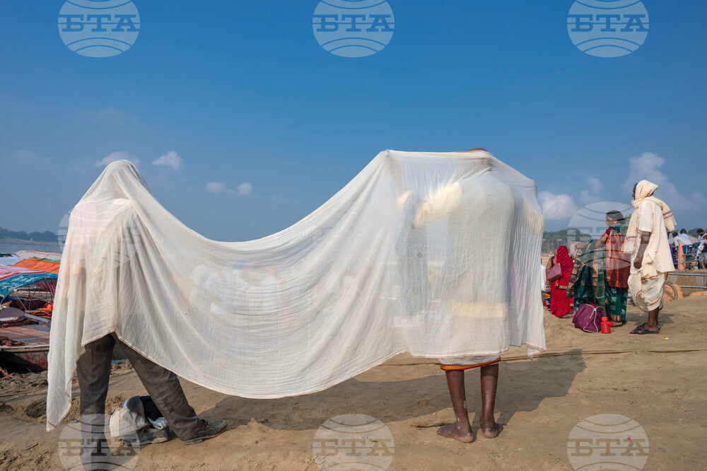Hindu devotees dry their cloths after a holy dip at Sangam, the confluence of the Rivers Ganges, Yamuna and mythical Saraswati in Prayagraj, in the northern Indian state of Uttar Pradesh, India, Tuesday, Sept. 30, 2025. (AP Photo/Rajesh Kumar Singh)