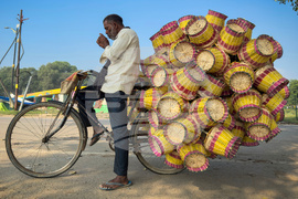 An Indian vendor sells colorful bamboo baskets roadside in Prayagraj, in the northern Indian state of Uttar Pradesh, India, Tuesday, Sept. 30, 2025. (AP Photo/Rajesh Kumar Singh)