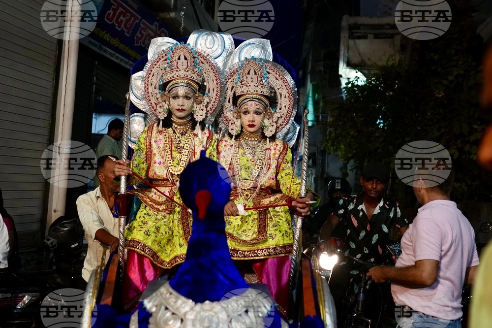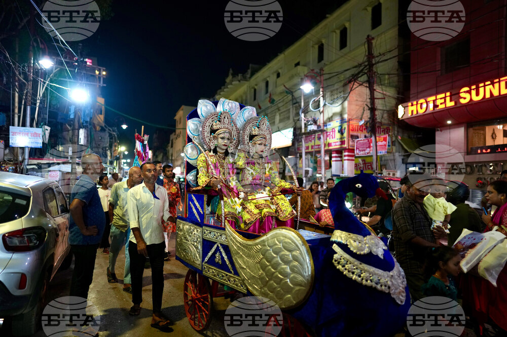 Artists dressed as Hindu deities Rama, left, and Lakshman, right, sit on a chariot being pulled by laborers ahead of a religious procession during the Dussehra festival also known as Vijayadashami, the day Rama killed demon king Ravana who had abducted Rama's wife Sita, in the northern Indian state of Uttar Pradesh, India, Tuesday, Sept. 30, 2025. (AP Photo/Rajesh Kumar Singh)