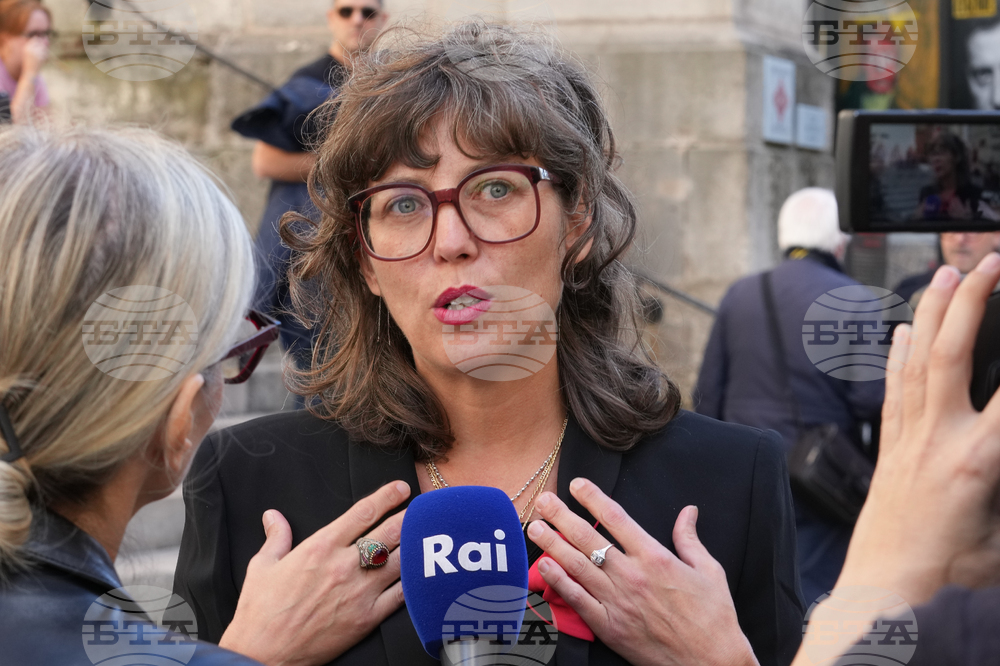Claudia Cardinale's daughter Claudia Squitieri answers reporters before the funeral ceremony for her mother, Tuesday, Sept. 30, 2025 in Paris. (AP Photo/Michel Euler)