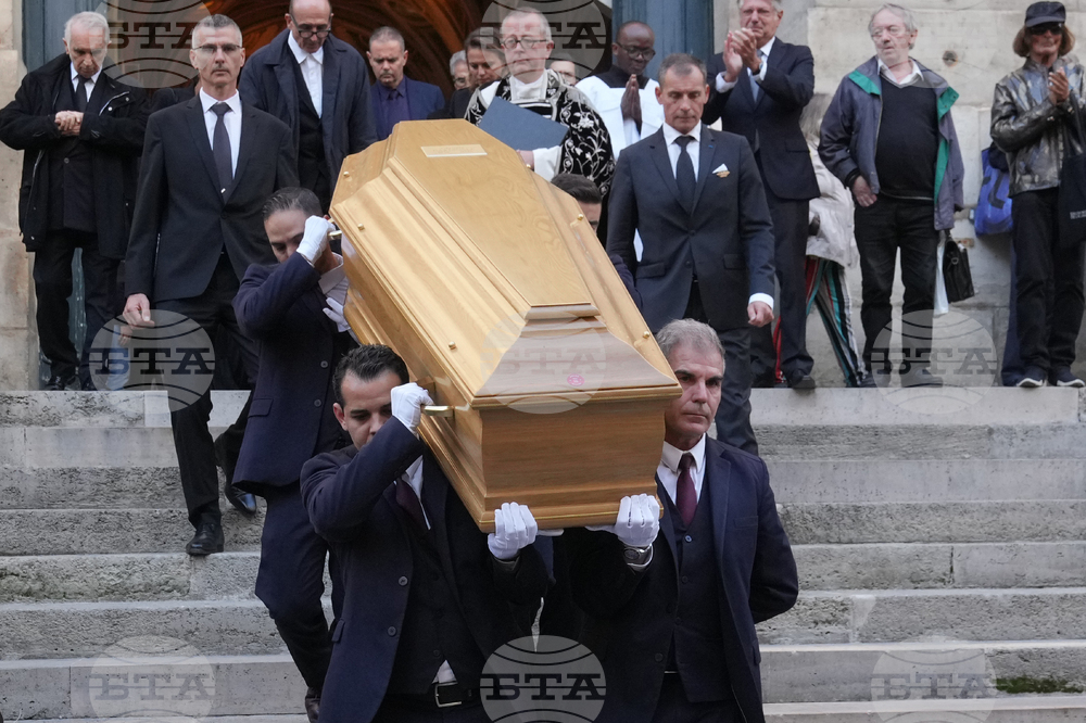 Pallbearers carry the casket of actor Claudia Cardinale after her funeral ceremony, Tuesday, Sept. 30, 2025 in Paris. (AP Photo/Michel Euler)