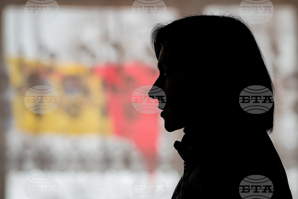 FILE - Pro-European presidential candidate Maia Sandu walks by a banner thet reads "I chose to defeat poverty, corruption, oligarchs" after voting ended in the presidential elections, in Chisinau, Moldova, Sunday, Nov. 13, 2016. (AP Photo/Andreea Alexandru, File)