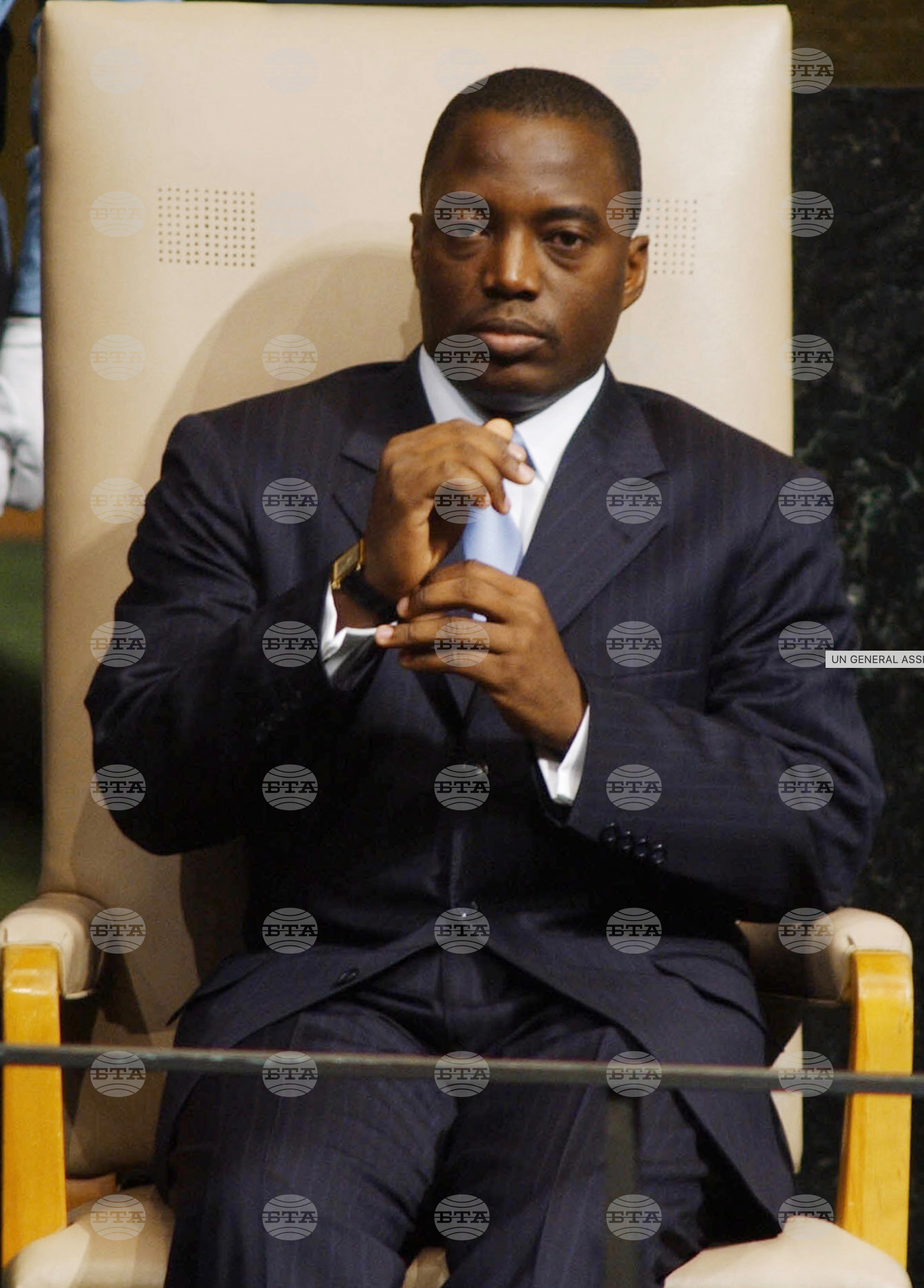 FILE - Joseph Kabila, president of the Democratic Republic of the Congo, listens after speaking to the 56th United Nations General Assembly, Nov. 11, 2001 at U.N. headquarters in New York. (AP Photo/Richard Drew, file)