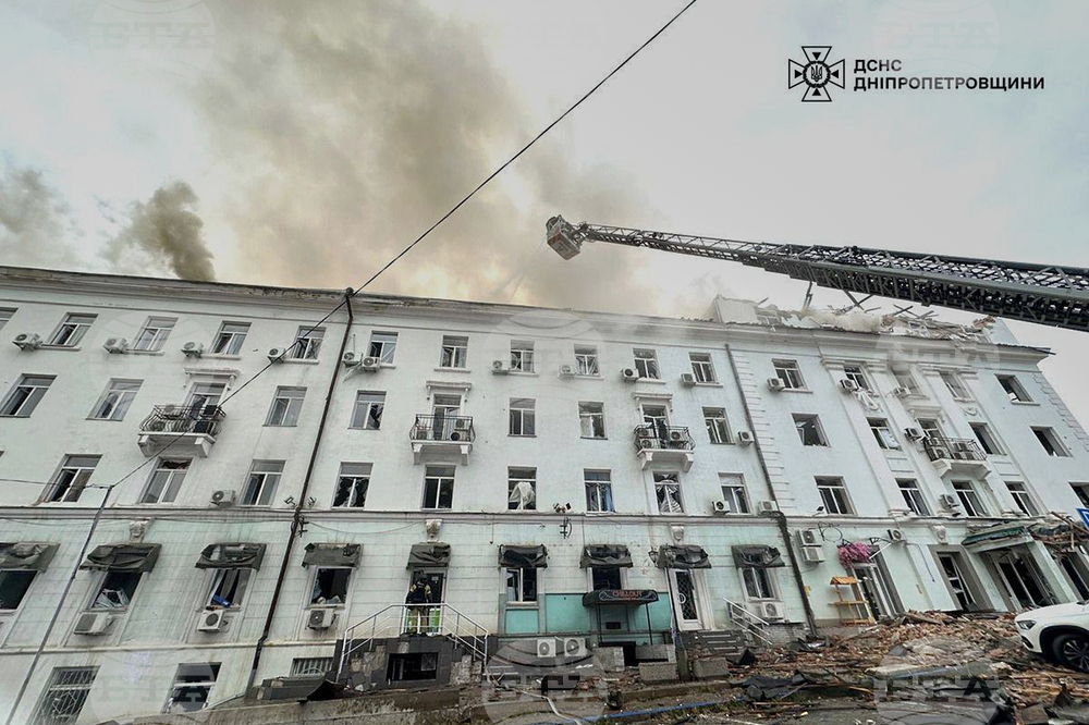 In this photo provided by the Ukrainian Emergency Service, firefighters put out the fire following a Russian drones attack in Dnipro, Ukraine, Tuesday, Sept. 30, 2025. (Ukrainian Emergency Service via AP)