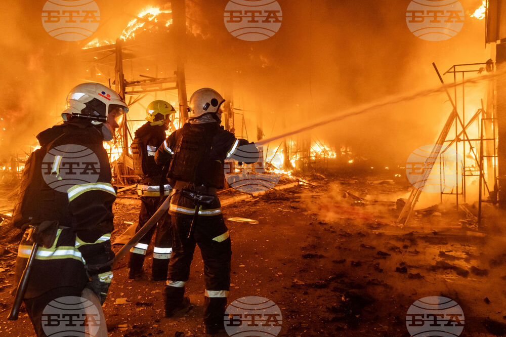 Firefighters tackle the blaze after a Russian air attack that hit at Barabashovo market in Kharkiv, Ukraine, Wednesday, Oct. 1, 2025. (AP Photo/Andrii Marienko)