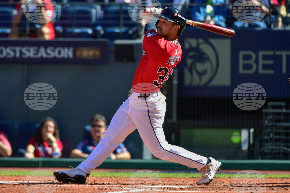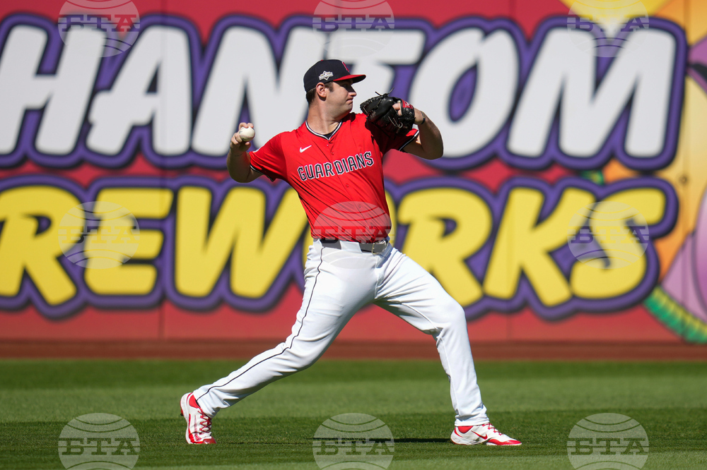 Cleveland Guardians left fielder Steven Kwan watches his line drive caught for the out by Detroit Tigers left fielder Riley Greene during the third inning of Game 1 of the American League Wild Card baseball playoff series in Cleveland, Tuesday, Sept. 30, 2025. (AP Photo/Phil Long)