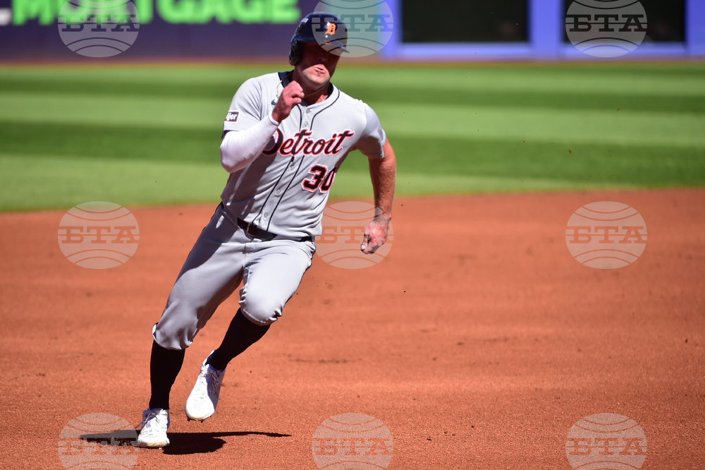 Detroit Tigers' Kerry Carpenter rounds third base to score on a single hit by Spencer Torkelson in the first inning of Game 1 of the American League Wild Card baseball playoff series against the Cleveland Guardians in Cleveland, Tuesday, Sept. 30, 2025. (AP Photo/Phil Long)