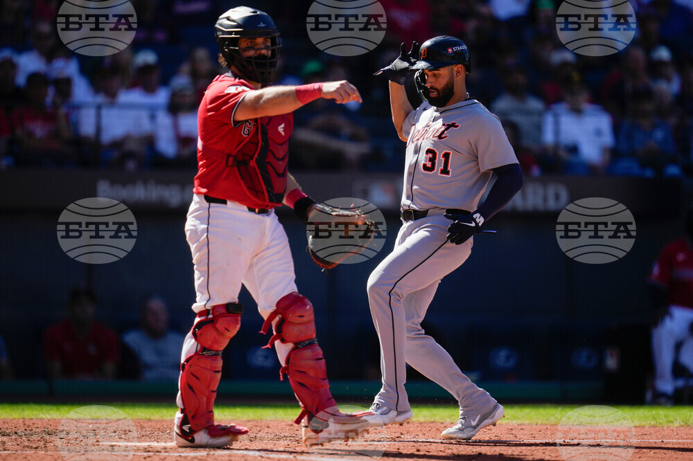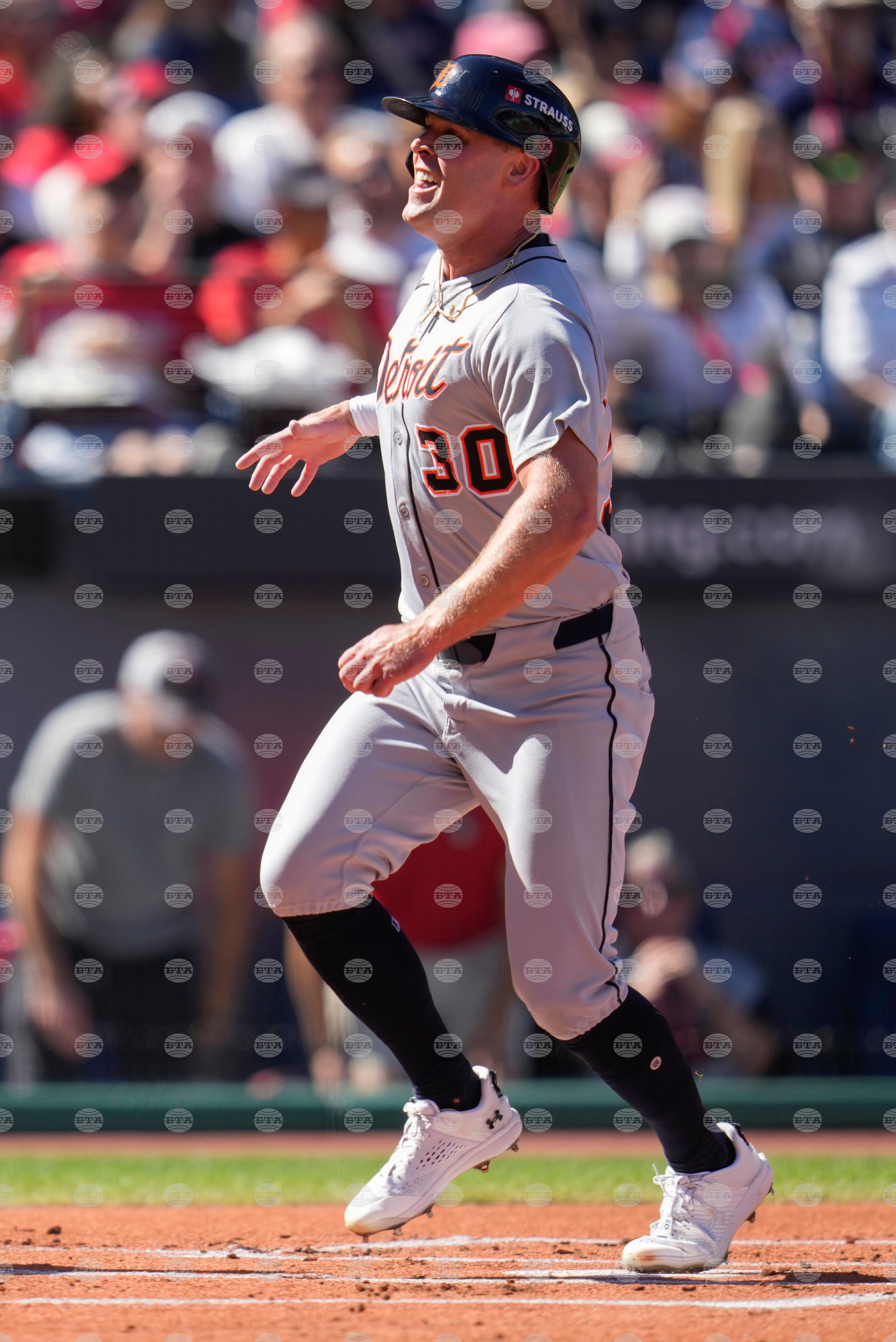 Detroit Tigers' Kerry Carpenter reacts as he scores on a single hit by Spencer Torkelson in the first inning of Game 1 of the American League Wild Card baseball playoff series against the Cleveland Guardians in Cleveland, Tuesday, Sept. 30, 2025. (AP Photo/Sue Ogrocki)
