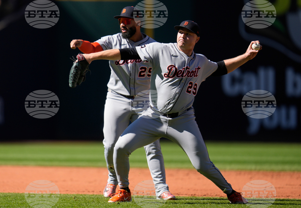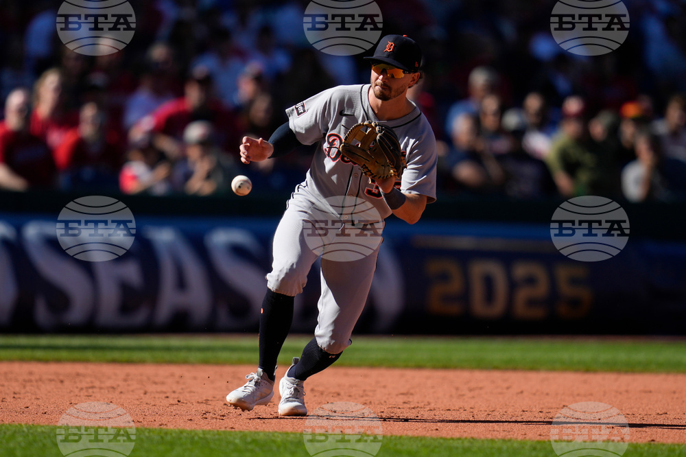 Detroit Tigers third baseman Zach McKinstry fields a ball hit by Cleveland Guardians' Steven Kwan and throws to first base for the out in fifth inning of Game 1 of the American League Wild Card baseball playoff series in Cleveland, Tuesday, Sept. 30, 2025. (AP Photo/Sue Ogrocki)