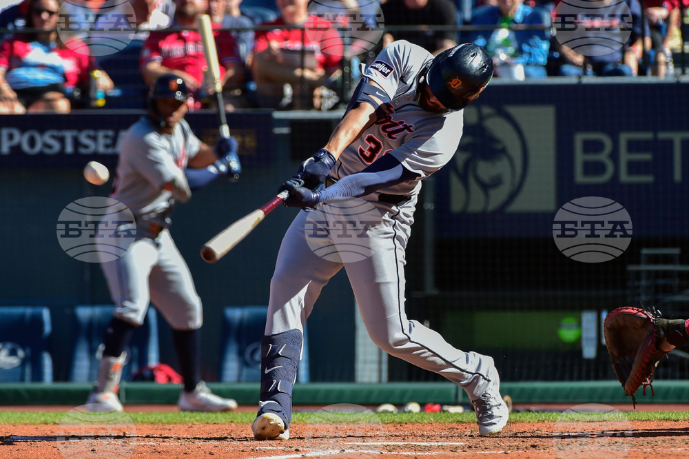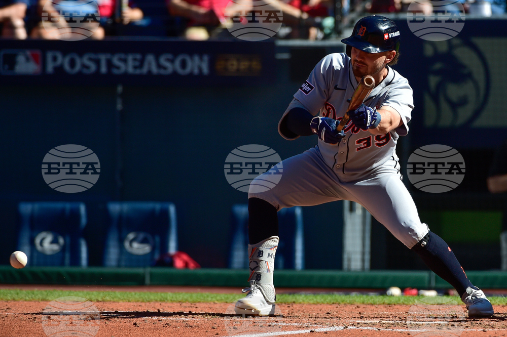 Detroit Tigers' Zach McKinstry hits a sacrifice bunt to score Riley Greene in the seventh inning of Game 1 of the American League Wild Card baseball playoff series against the Cleveland Guardians in Cleveland, Tuesday, Sept. 30, 2025. (AP Photo/Phil Long)