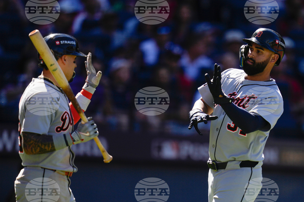 Detroit Tigers' Kerry Carpenter, right, celebrates with Riley Greene, left, after Carpenter scored on a single hit by Spencer Torkelson in the first inning Game 1 of the American League Wild Card baseball playoff series against the Cleveland Guardians in Cleveland, Tuesday, Sept. 30, 2025. (AP Photo/Sue Ogrocki)