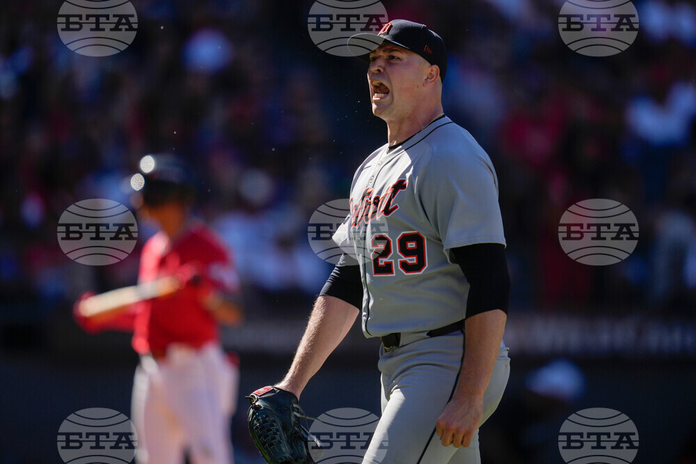 Detroit Tigers starting pitcher Tarik Skubal (29) throws to home plate as Detroit Tigers second baseman Gleyber Torres (25) points in the fourth inning of Game 1 of the American League Wild Card baseball playoff series against the Cleveland Guardians in Cleveland, Tuesday, Sept. 30, 2025. (AP Photo/Sue Ogrocki)
