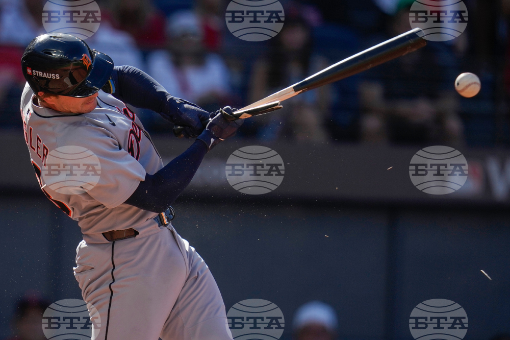 Detroit Tigers' Dillon Dingler breaks his bat as he lines out softly to Cleveland Guardians second baseman Brayan Rocchio ninth inning of Game 1 of the American League Wild Card baseball playoff series in Cleveland, Tuesday, Sept. 30, 2025. (AP Photo/Sue Ogrocki)
