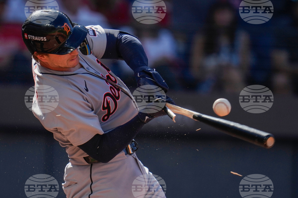Detroit Tigers' Riley Greene hits a double in the seventh inning of Game 1 of the American League Wild Card baseball playoff series against the Cleveland Guardians in Cleveland, Tuesday, Sept. 30, 2025. (AP Photo/Phil Long)