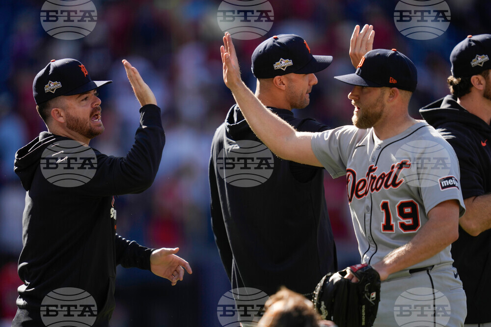 Detroit Tigers pitcher Will Vest (19) celebrates with teammates after winning Game 1 of the American League Wild Card baseball playoff series against the Cleveland Guardians in Cleveland, Tuesday, Sept. 30, 2025. (AP Photo/Sue Ogrocki)