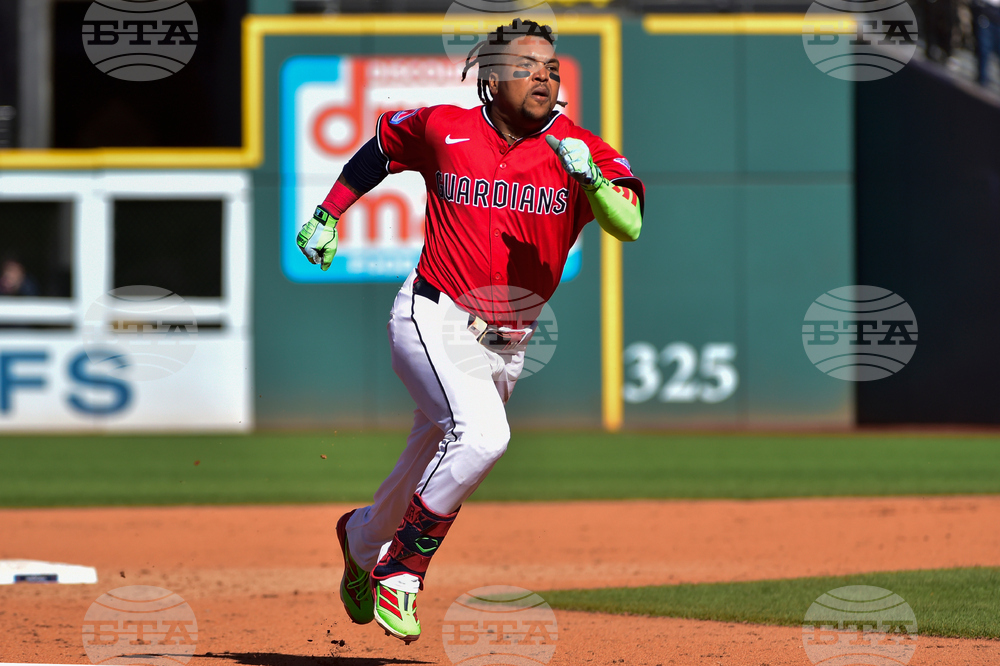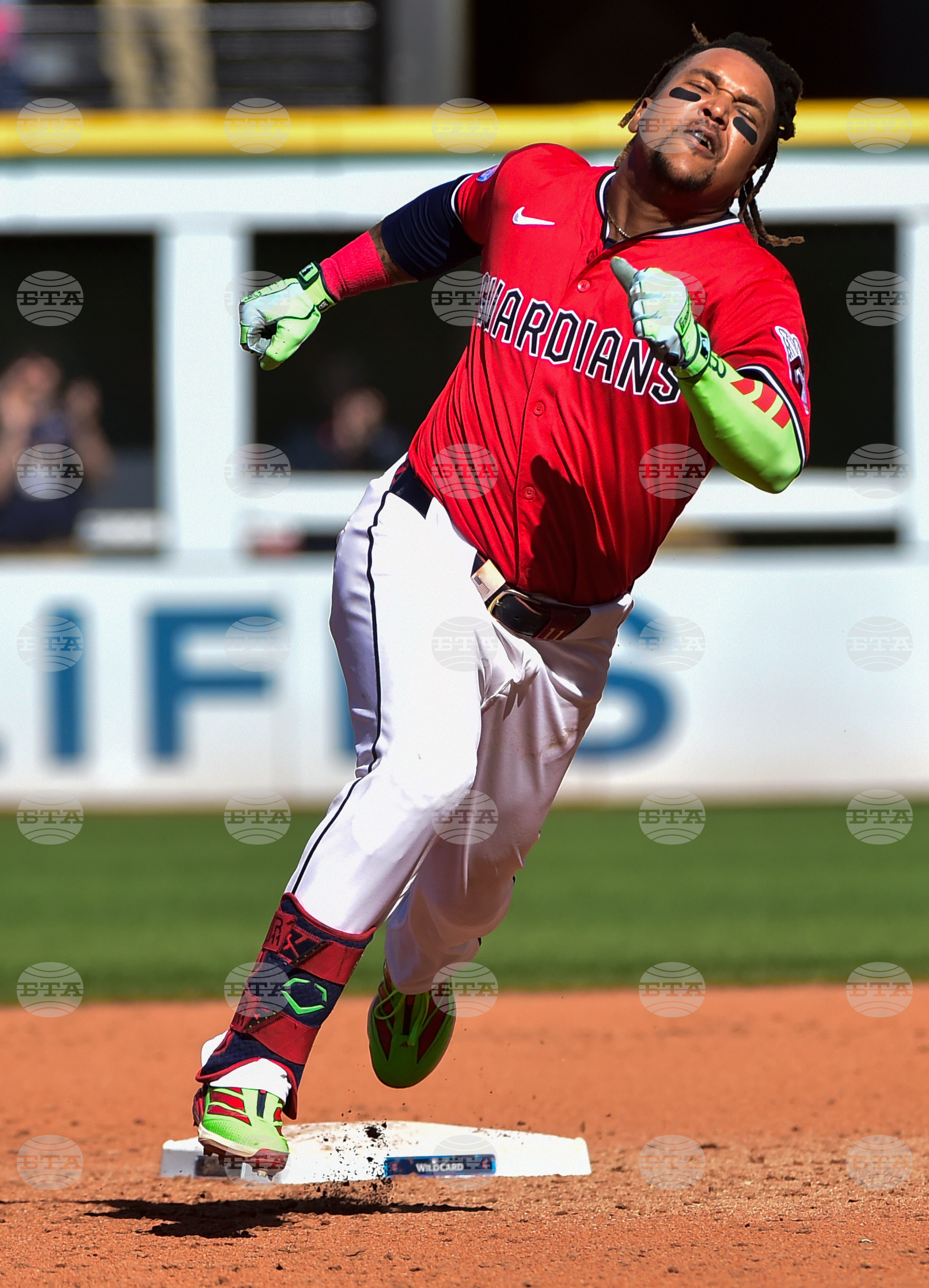 Cleveland Guardians' Jose Ramirez runs to third base on a throwing error by Detroit Tigers shortstop Javier Báez in the ninth inning of Game 1 of the American League Wild Card baseball playoff series in Cleveland, Tuesday, Sept. 30, 2025. (AP Photo/Phil Long)