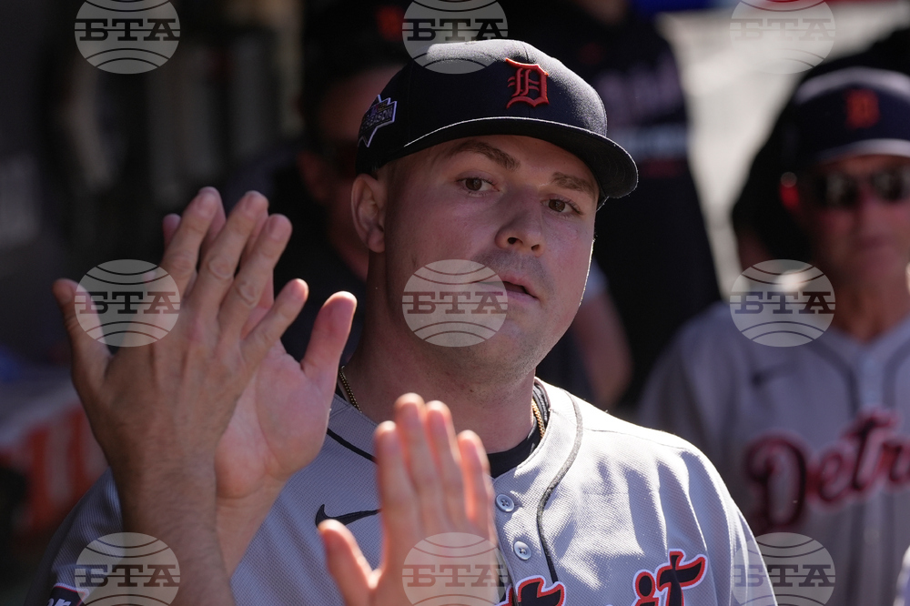 Detroit Tigers starting pitcher Tarik Skubal celebrates in the dugout after leaving the game in the eighth inning of Game 1 of the American League Wild Card baseball playoff series against the Cleveland Guardians in Cleveland, Tuesday, Sept. 30, 2025. (AP Photo/Sue Ogrocki)