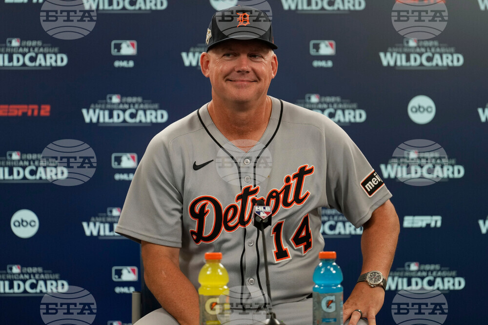 Detroit Tigers manager A.J. Hinch speaks during a news conference following Game 1 of the American League Wild Card baseball playoff series against the Cleveland Guardians in Cleveland, Tuesday, Sept. 30, 2025. (AP Photo/Sue Ogrocki)