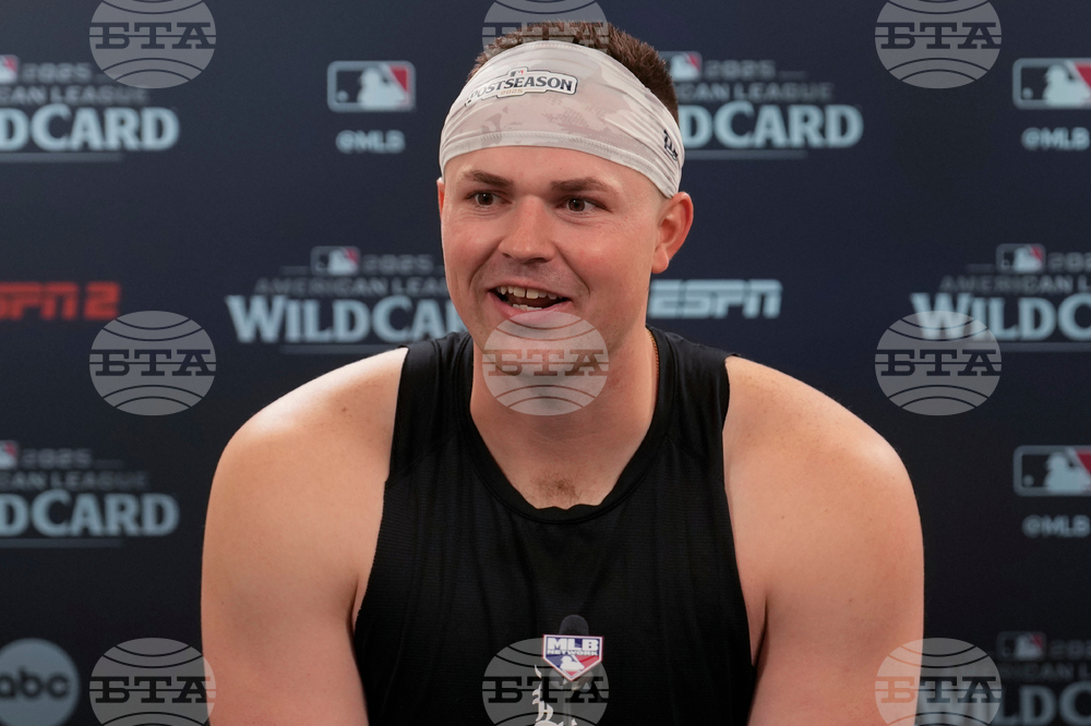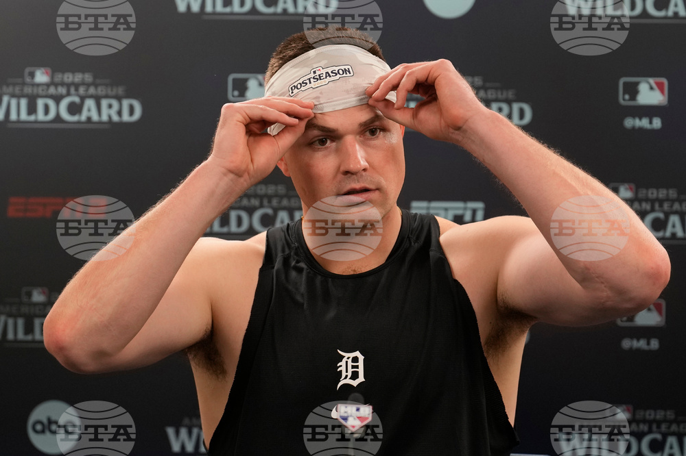 Detroit Tigers starting pitcher Tarik Skubal adjusts his postseason head band as he speaks during a news conference following Game 1 of the American League Wild Card baseball playoff series against the Cleveland Guardians in Cleveland, Tuesday, Sept. 30, 2025. (AP Photo/Sue Ogrocki)