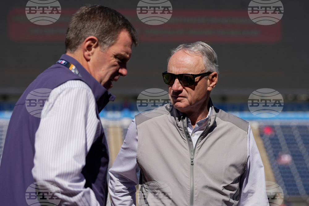 MLB Commissioner Rob Manfred, right, is seen on the field before Game 2 of the American League Wild Card baseball playoff series between the Cleveland Guardians and the Detroit Tigers in Cleveland, Wednesday, Oct. 1, 2025. (AP Photo/Sue Ogrocki)