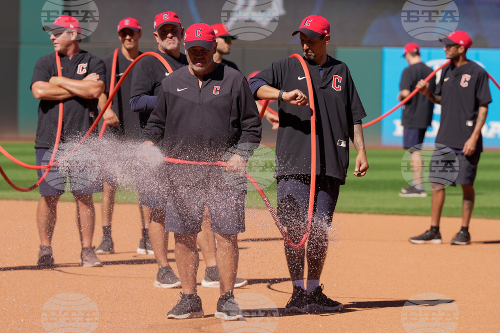 Member of the grounds crew wet the field before Game 2 of the American League Wild Card baseball playoff series between the Cleveland Guardians and the Detroit Tigers in Cleveland, Wednesday, Oct. 1, 2025. (AP Photo/Sue Ogrocki)