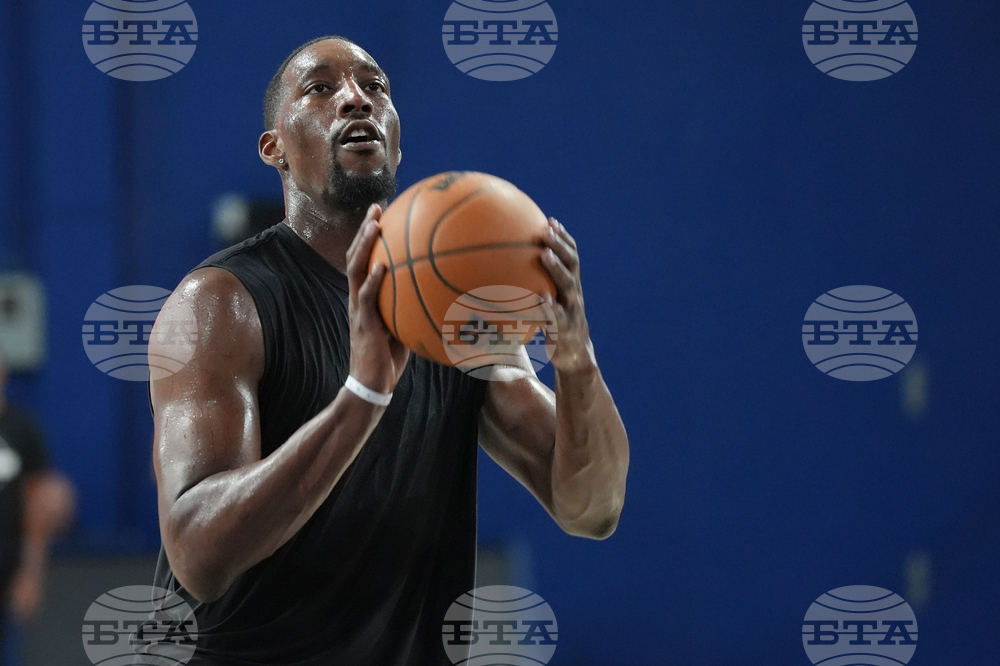 Miami Heat center Bam Adebayo aims a shot during the NBA basketball team's training camp, Tuesday, Sept. 30, 2025, in Boca Raton, Fla. (AP Photo/Marta Lavandier)
