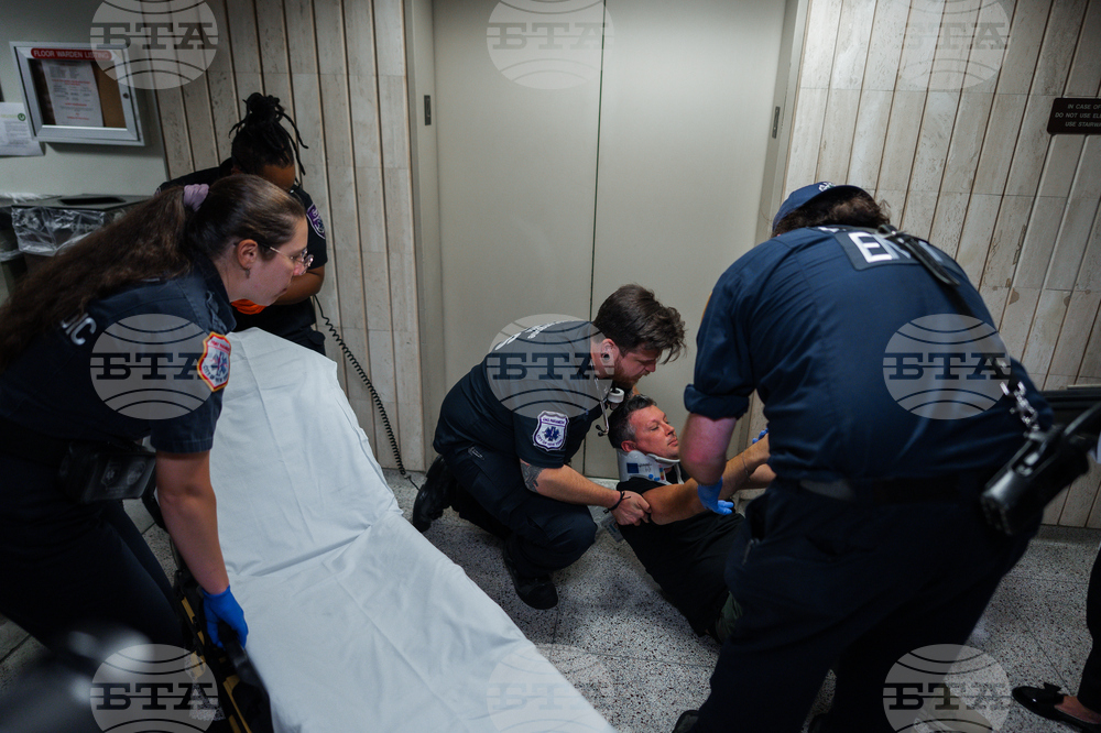 Medics transfer journalist L. Vural Elibol to a gurney after he was shoved by federal agents in immigration court on Tuesday, Sept. 30, 2025, in New York. (AP Photo/Olga Fedorova)