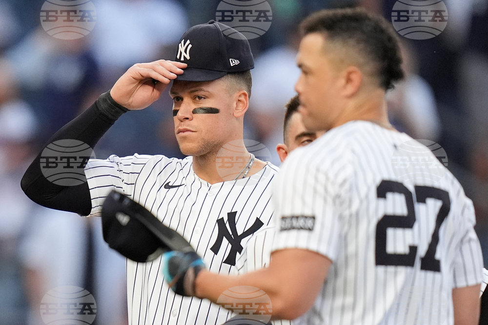 New York Yankees outfielder Aaron Judge (99) and designated hitter Giancarlo Stanton (27) prepare to play against the Boston Red Sox in Game 1 of an American League wild-card baseball playoff series, Tuesday, Sept. 30, 2025, in New York. (AP Photo/Frank Franklin II)
