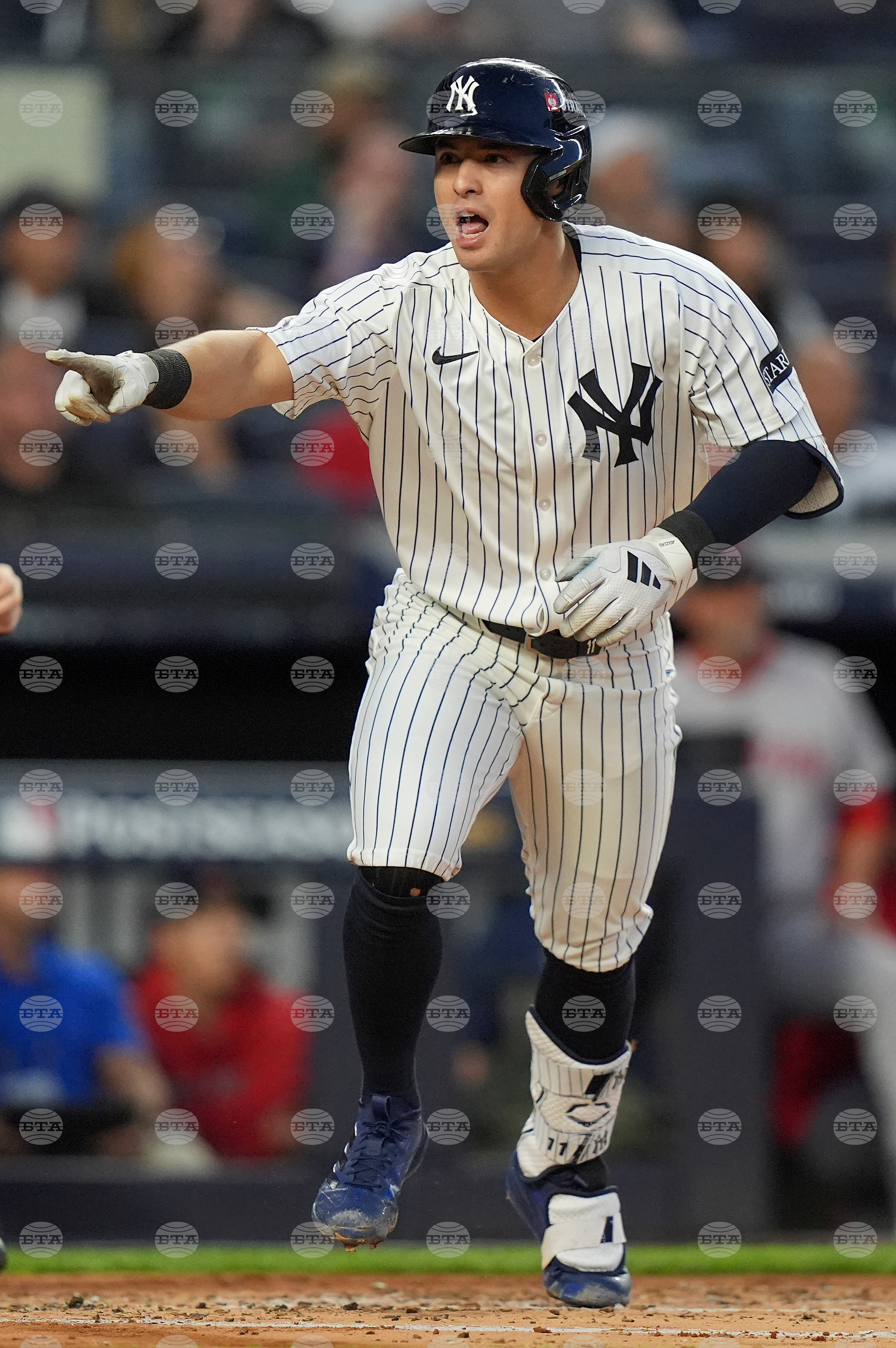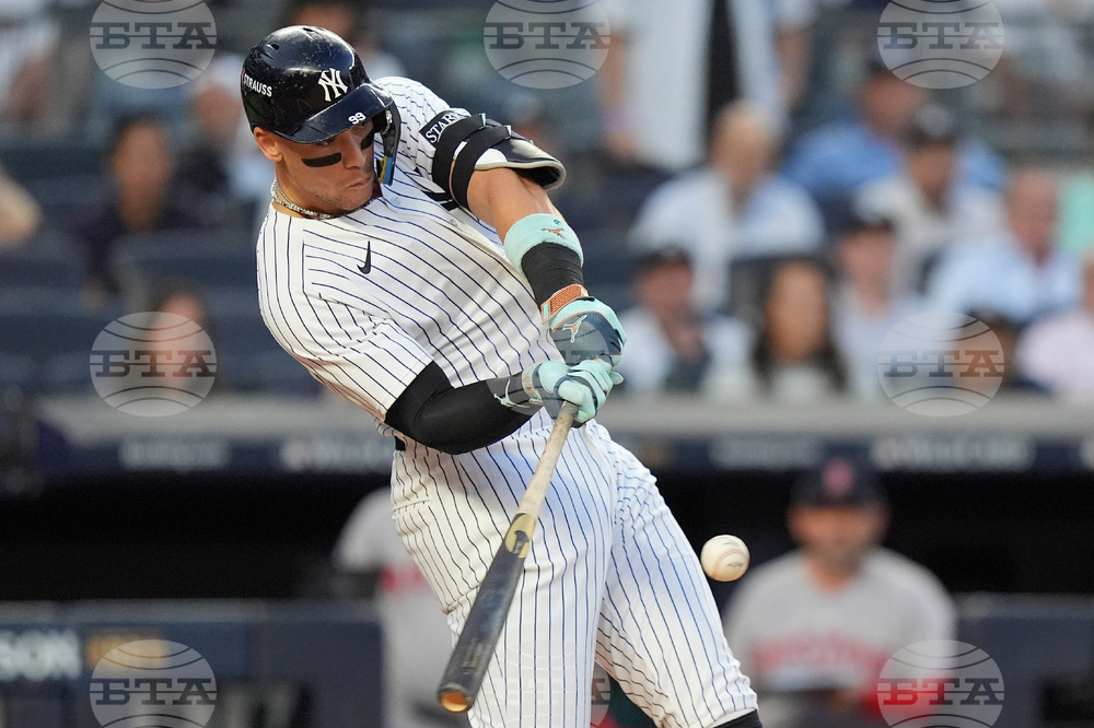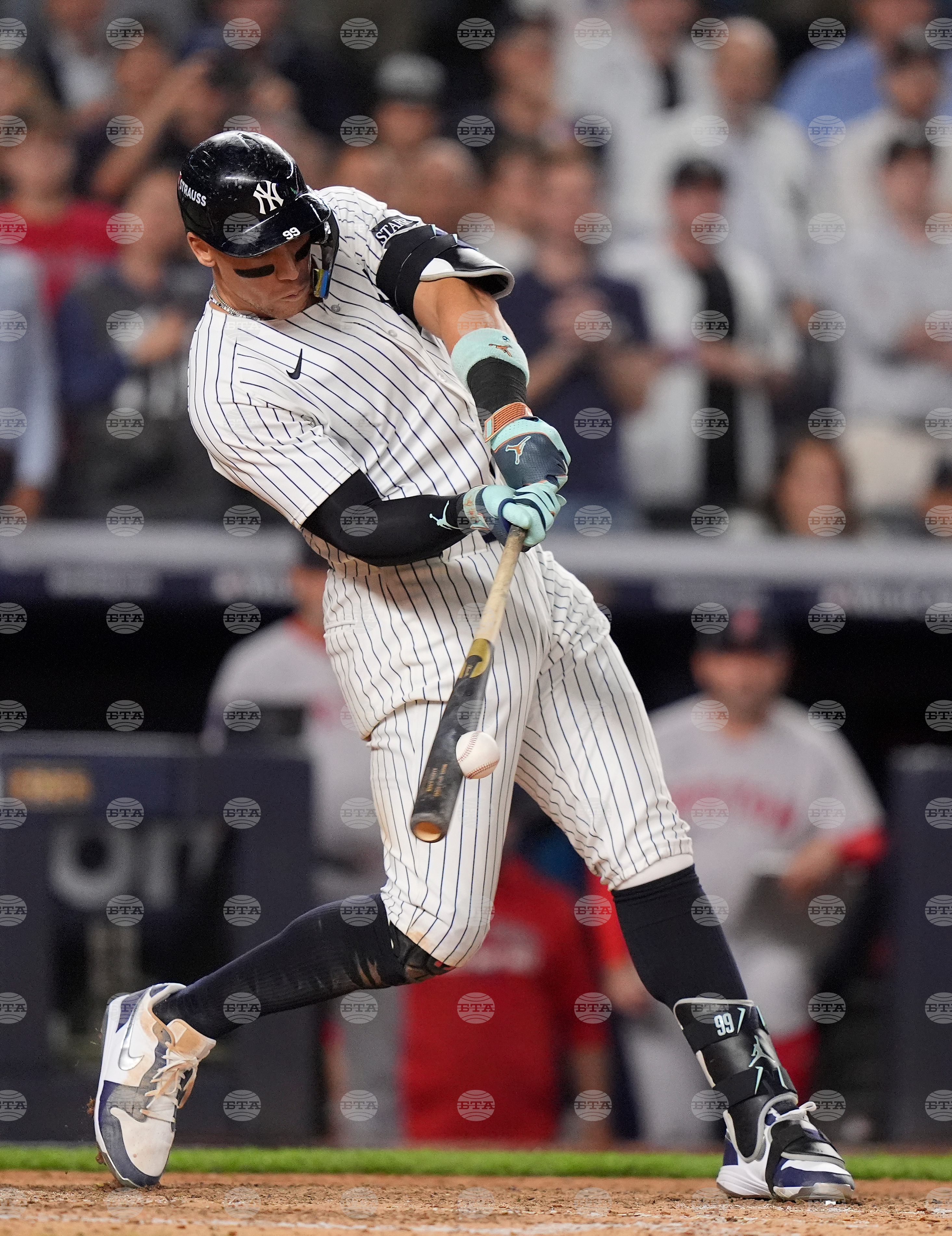 New York Yankees outfielder Aaron Judge (99) connects for a base hit against the Boston Red Sox during the first inning of Game 1 of an American League wild-card baseball playoff series, Tuesday, Sept. 30, 2025, in New York. (AP Photo/Frank Franklin II)