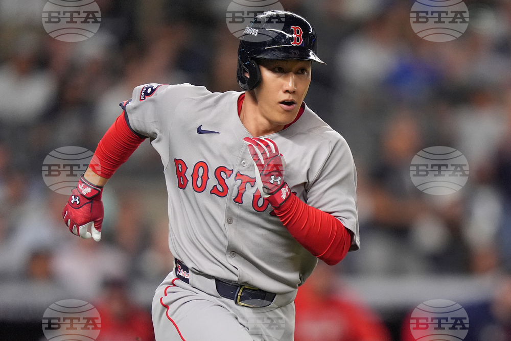 Boston Red Sox outfielder Masataka Yoshida heads to first base after connecting for a two-run RBI single against the New York Yankees during the seventh inning of Game 1 of an American League wild-card baseball playoff series, Tuesday, Sept. 30, 2025, in New York. (AP Photo/Frank Franklin II)