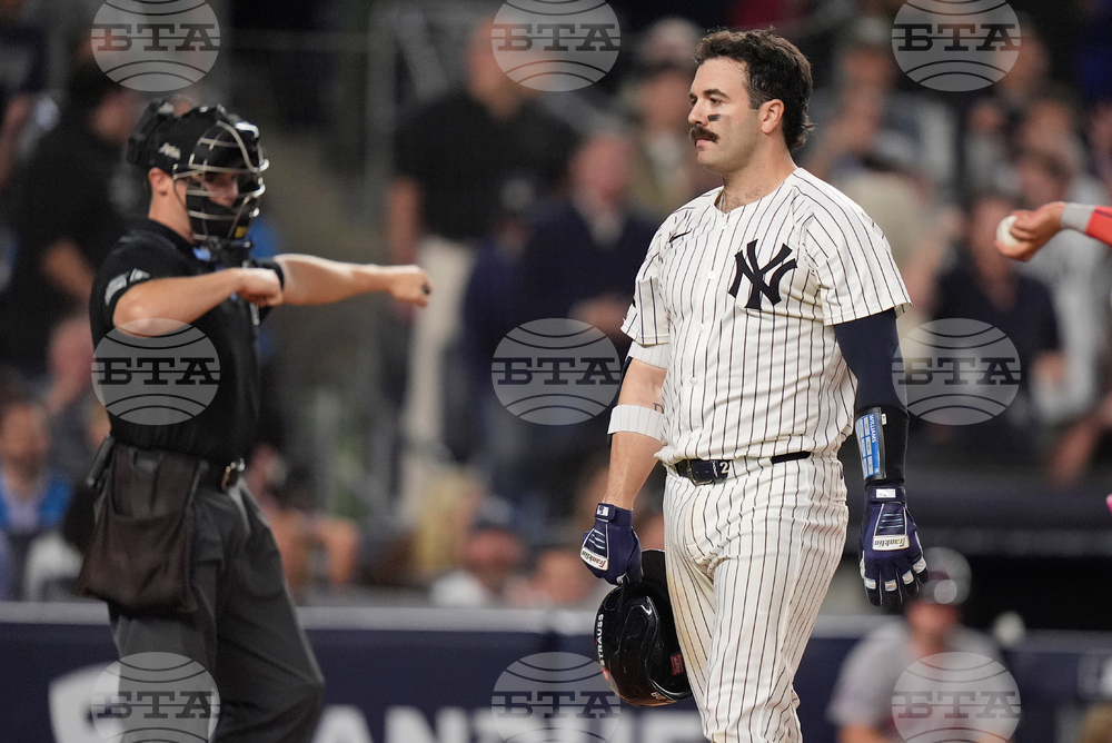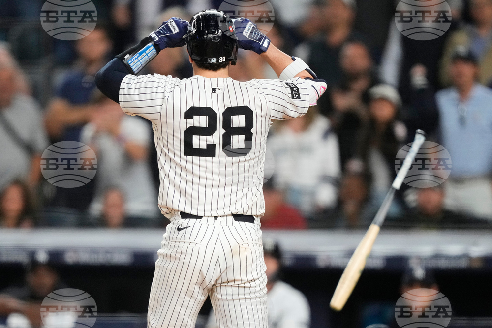 New York Yankees outfielder Aaron Judge reacts after striking out against the Boston Red Sox during the sixth inning of Game 1 of an American League wild-card baseball playoff series, Tuesday, Sept. 30, 2025, in New York. (AP Photo/Frank Franklin II)