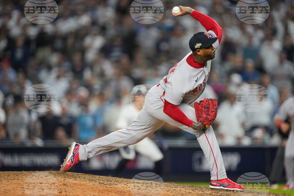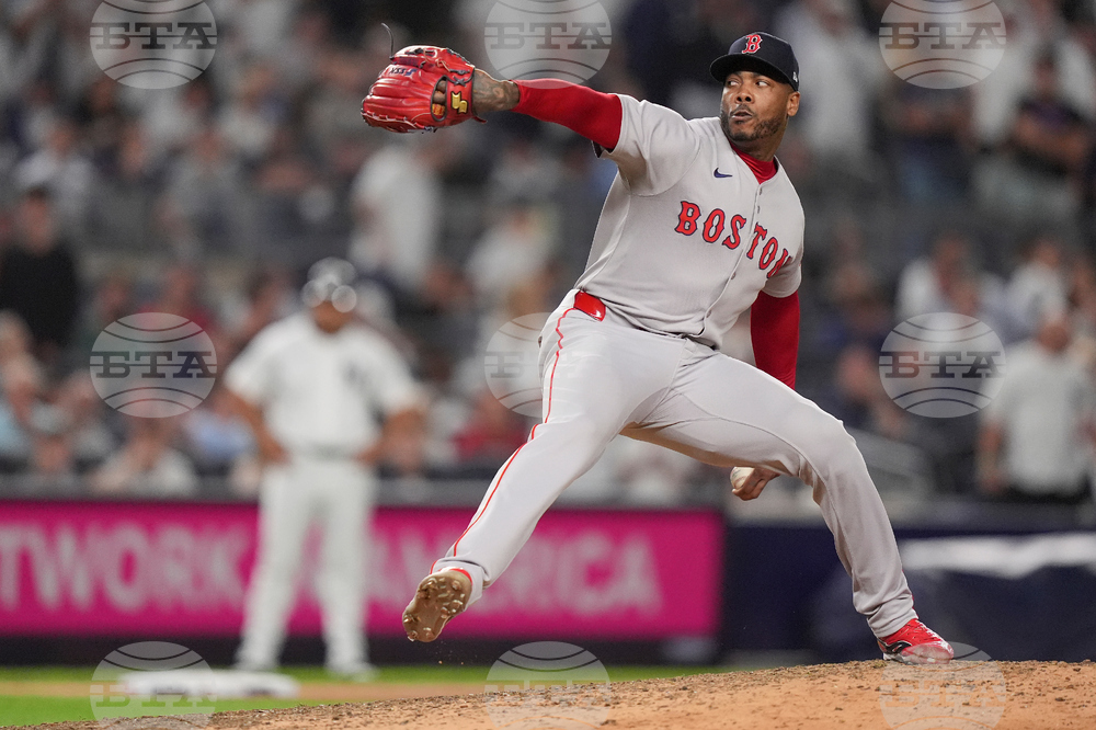 Boston Red Sox pitcher Aroldis Chapman delivers against the New York Yankees during the ninth inning of Game 1 of an American League wild-card baseball playoff series, Tuesday, Sept. 30, 2025, in New York. (AP Photo/Frank Franklin II)