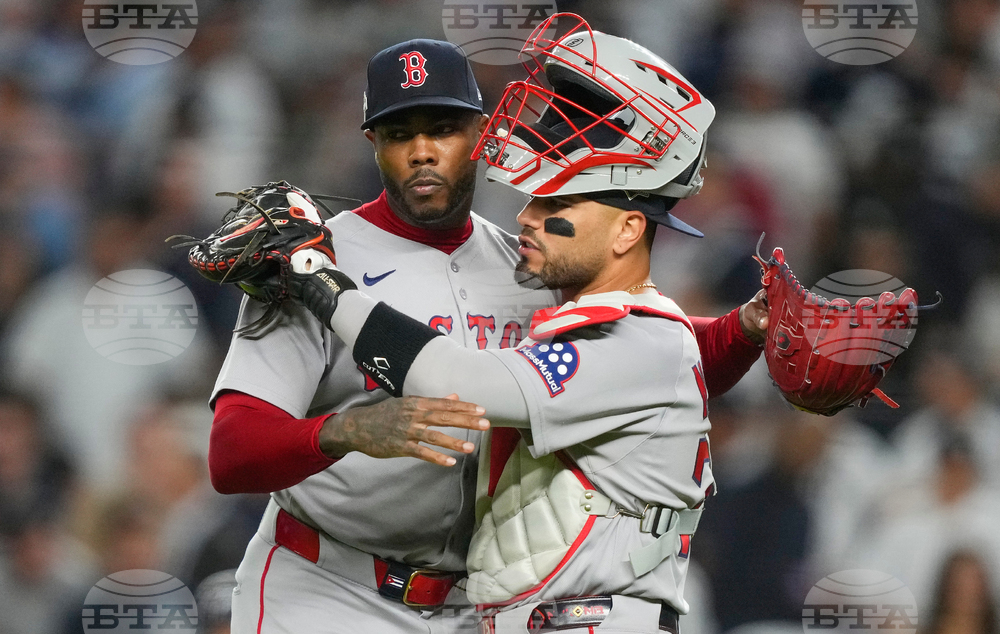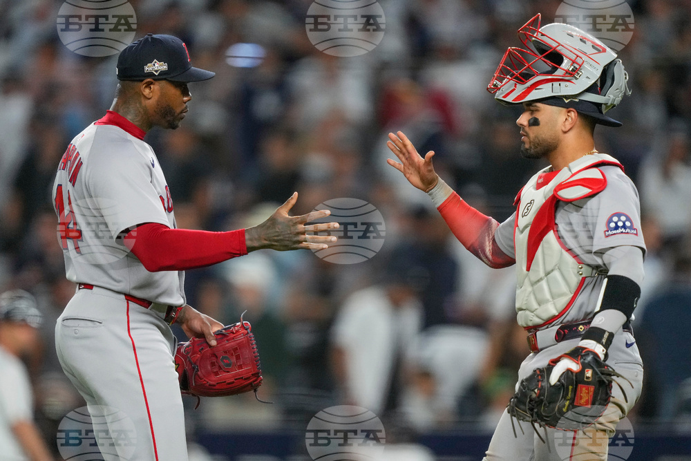 Boston Red Sox pitcher Aroldis Chapman, left, and catcher Carlos Narváez celebrate after defeating the New York Yankees in Game 1 of an American League wild-card baseball playoff series, Tuesday, Sept. 30, 2025, in New York. (AP Photo/Yuki Iwamura)