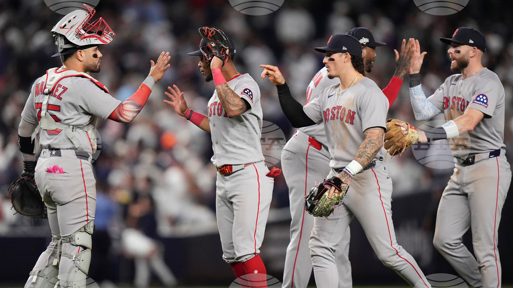 The Boston Red Sox celebrate after beating the New York Yankees in Game 1 of an American League wild-card baseball playoff series, Tuesday, Sept. 30, 2025, in New York. (AP Photo/Frank Franklin II)