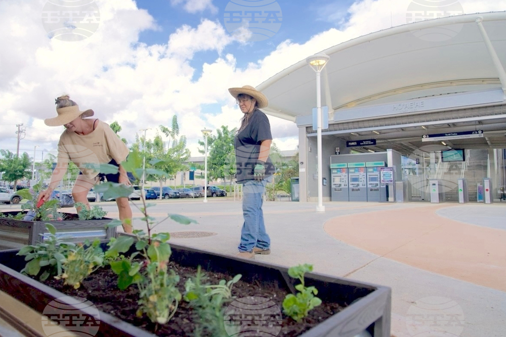 In this photo provided by Honolulu Civil Beat, people garden at one of Skyline's test sites for the Bloomberg Philanthropies Mayors Challenge at Hō'ae'ae Station in West Loch, Hawaii, Thursday, Sept. 25, 2025. (Thomas Heaton/Civil Beat via AP)