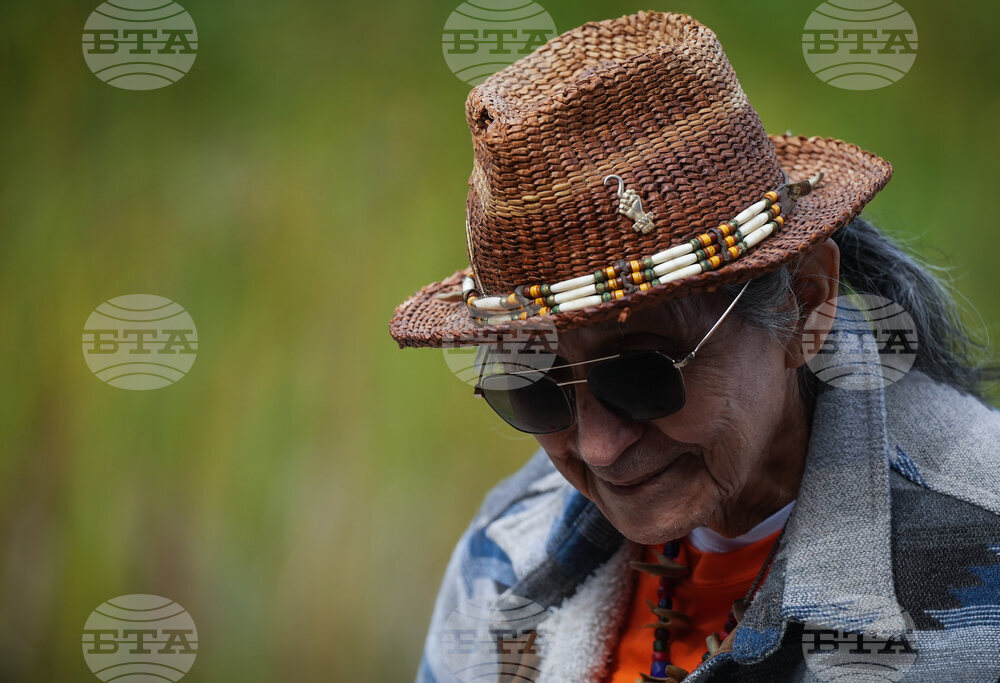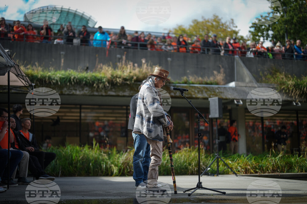 Squamish Nation Elder Sam George, a survivor of St. Paul's Residential School, listens during a gathering to mark the National Day for Truth and Reconciliation, in Vancouver, on Tuesday, Sept. 30, 2025. (Darryl Dyck/The Canadian Press via AP)