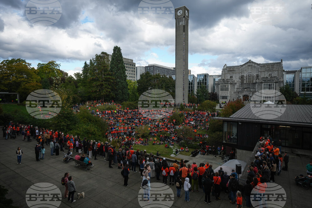 People listen during a gathering to mark the National Day for Truth and Reconciliation at the University of British Columbia, in Vancouver, on Tuesday, September 30, 2025. THE CANADIAN PRESS/Darryl Dyck/The Canadian Press via AP)